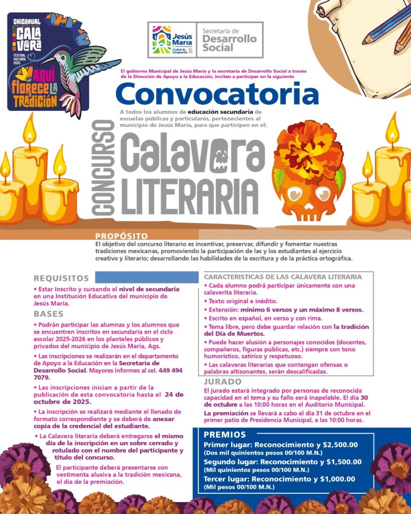 💀🎨 En el marco del Chiquanal de Calavera 2025 “Aquí florece la tradición”, el Gobierno Municipal de Jesús María, a través de la Secretaría de Desarrollo Social y la Dirección de Apoyo a la Educación, presentó tres convocatorias dirigidas a estudiantes de distintos niveles educativos con el propósito de preservar las tradiciones mexicanas, fortalecer la identidad cultural y promover el talento artístico y literario de las nuevas generaciones. 👇🏾👇🏾