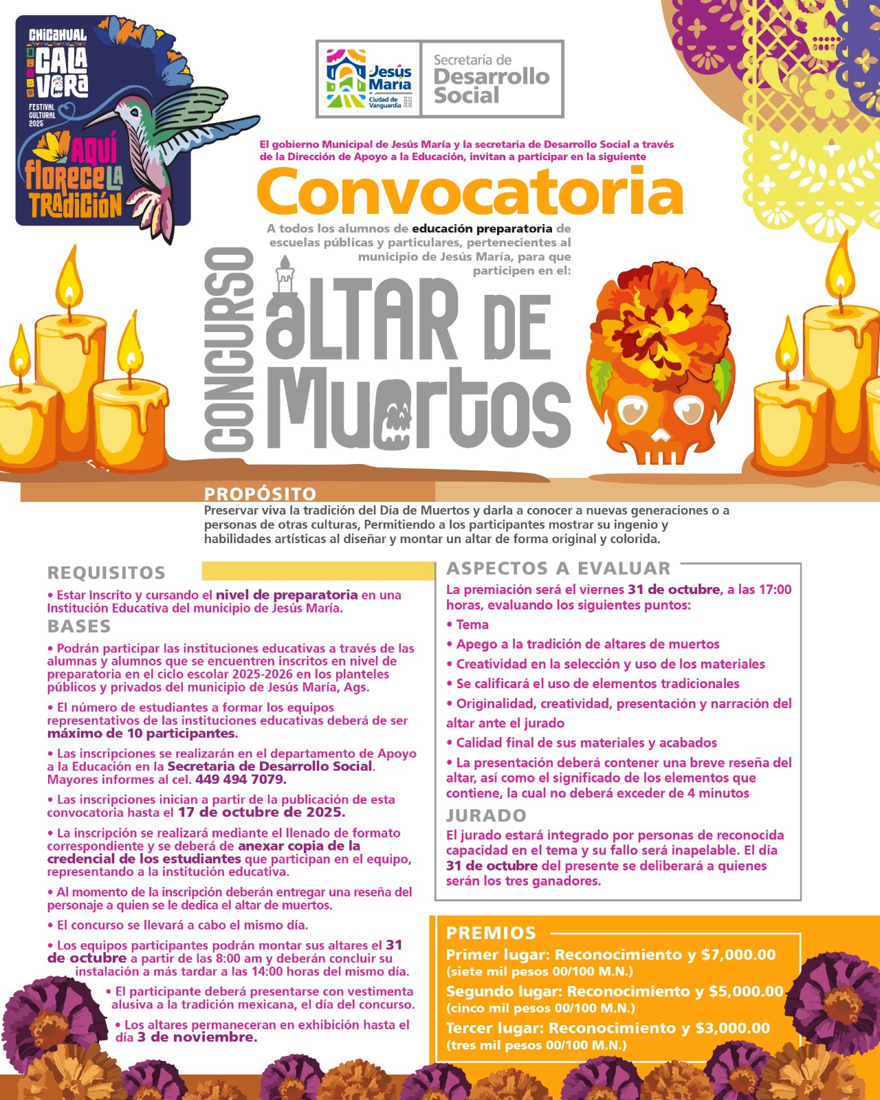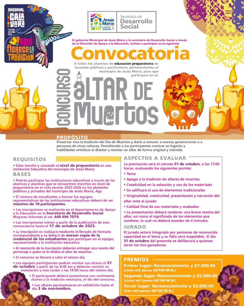 🕯️✨ Con estas tres convocatorias “Pinta tu Calavera”, “Calavera Literaria” y “Altar de Muertos”, el Gobierno Municipal de Jesús María reafirma su compromiso con la educación, el arte, la cultura y las tradiciones mexicanas, brindando a niñas, niños y jóvenes la oportunidad de expresar su talento, fortalecer su sentido de identidad y rendir homenaje a quienes nos precedieron. En Jesús María, el arte florece, las tradiciones viven y la cultura se transmite con orgullo de generación en generación. 🌼🕯️