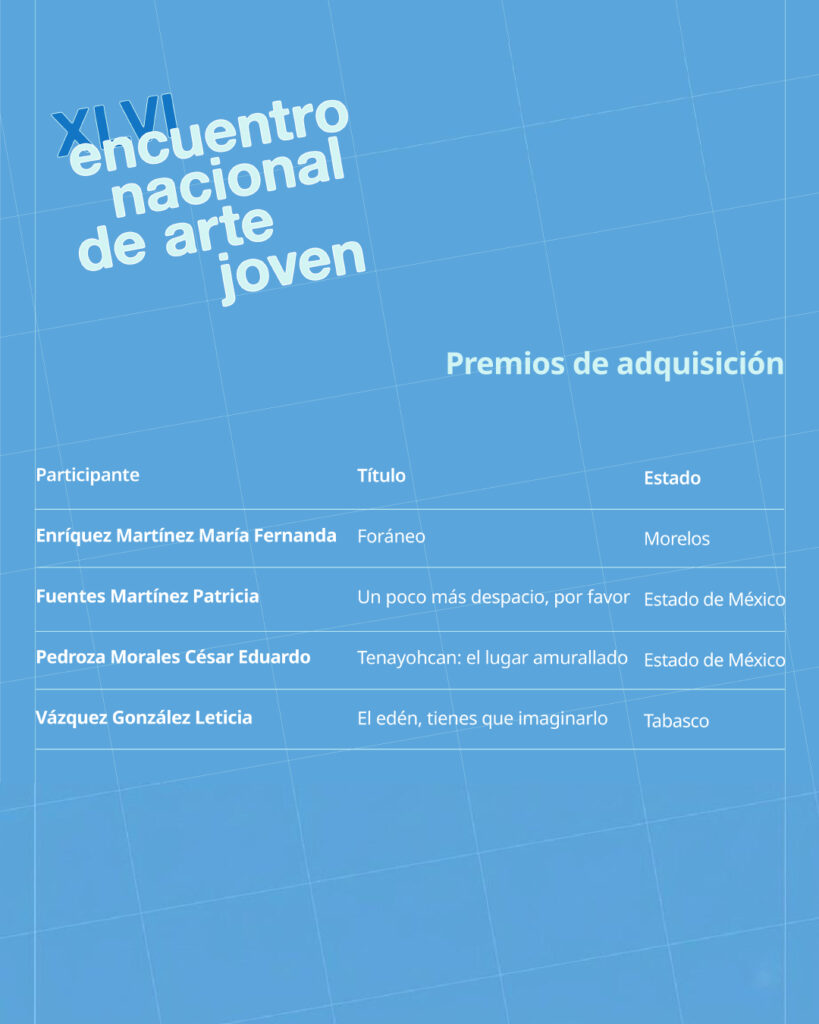 Tras un proceso de análisis y deliberación, se otorgaron los premios de adquisición a María Fernanda Enríquez Martínez, originaria de Morelos, por la obra “Foráneo”; Patricia Fuentes Martínez, del Estado de México, por “Un poco más despacio, por favor”; César Eduardo Pedroza Morales, también del Estado de México, por “Tenayohcan: el lugar amurallado”; y Leticia Vázquez González, de Tabasco, por “El edén, tienes que imaginarlo”.