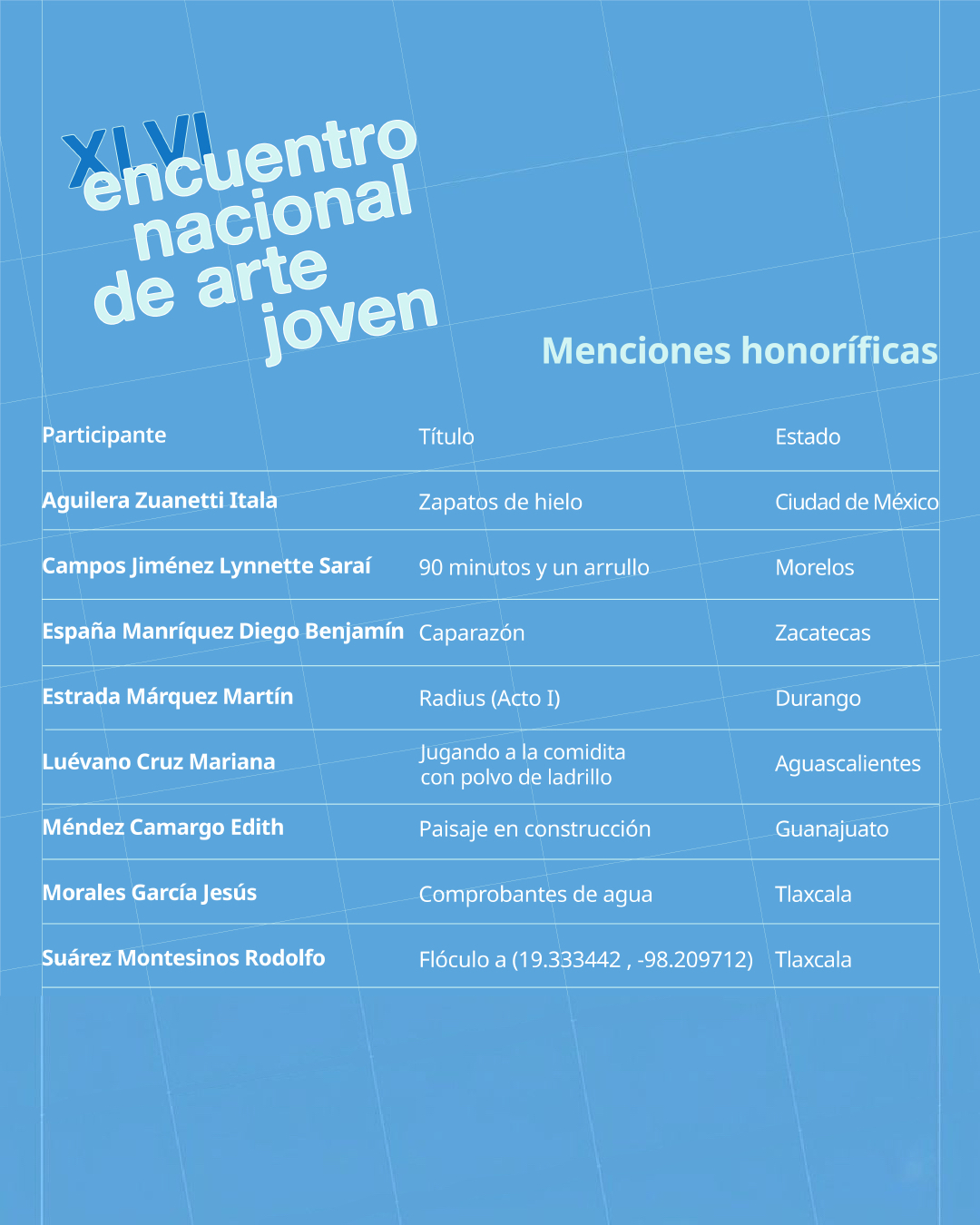 Asimismo, el jurado reconoció con menciones honoríficas a ocho artistas provenientes de distintas entidades del país: Mariana Luévano Cruz, de Aguascalientes, por “Jugando a la comidita con polvo de ladrillo”; Ítala Aguilera Zuanetti, de la Ciudad de México, por “Zapatos de hielo”; Lynnette Saraí Campos Jiménez, de Morelos, por “90 minutos y un arrullo”; Diego Benjamín España Manríquez, de Zacatecas, por “Caparazón”; Martín Estrada Márquez, de Durango, por “Radius (Acto I)”; Edith Méndez Camargo, de Guanajuato, por “Paisaje en construcción”; Jesús Morales García, de Tlaxcala, por “Comprobantes de agua”; y Rodolfo Suárez Montesinos, también de Tlaxcala, por “Flóculo a (19.333442, -98.209712)”.