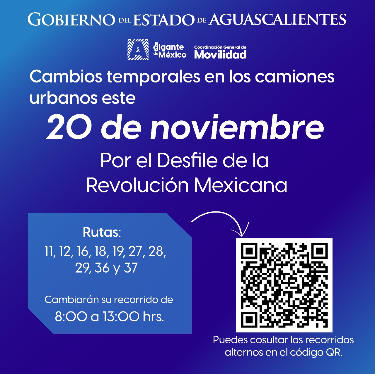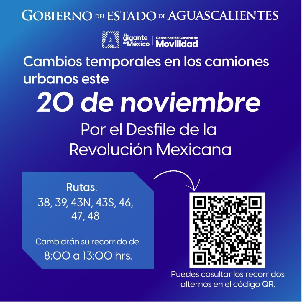 🚌🇲🇽✨ Este 20 de noviembre, Aguascalientes vivirá una de las celebraciones más importantes del año: el desfile por el CXV Aniversario de la Revolución Mexicana. Para asegurar un flujo ordenado, seguro y funcional en las principales vialidades, el Gobierno del Estado anunció ajustes temporales en 27 rutas de transporte urbano, cambios que permitirán mantener el servicio sin afectar el desarrollo del evento cívico. 👇🏽👇🏽