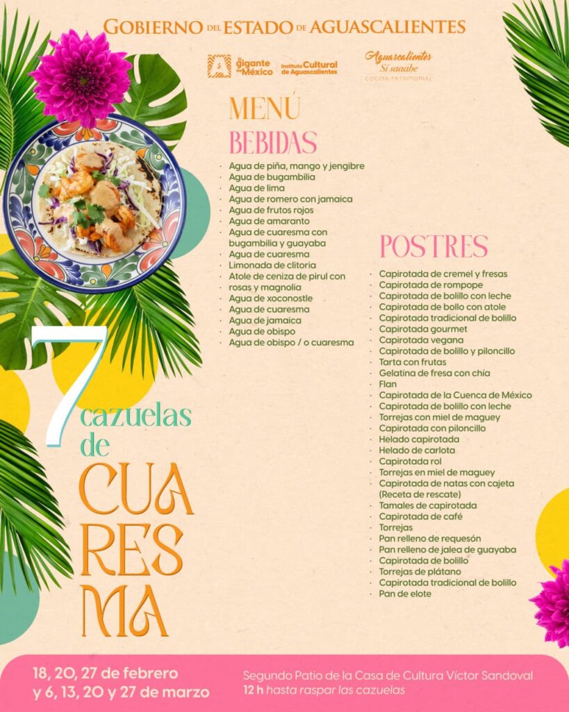 El Gobierno del Estado de Aguascalientes, a través del Instituto Cultural de Aguascalientes y el programa de Cocina Patrimonial “Aguascalientes Sí Saaabe”, impulsa esta experiencia gastronómica los días 18, 20 y 27 de febrero, así como 6, 13, 20 y 27 de marzo, en el Segundo Patio de la Casa de la Cultura Víctor Sandoval. La venta inicia a partir de las 12:00 horas y se mantiene hasta que se terminen los platillos.