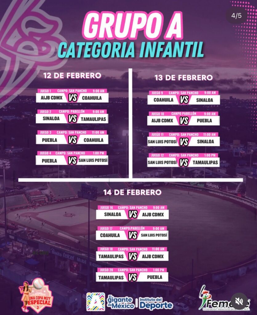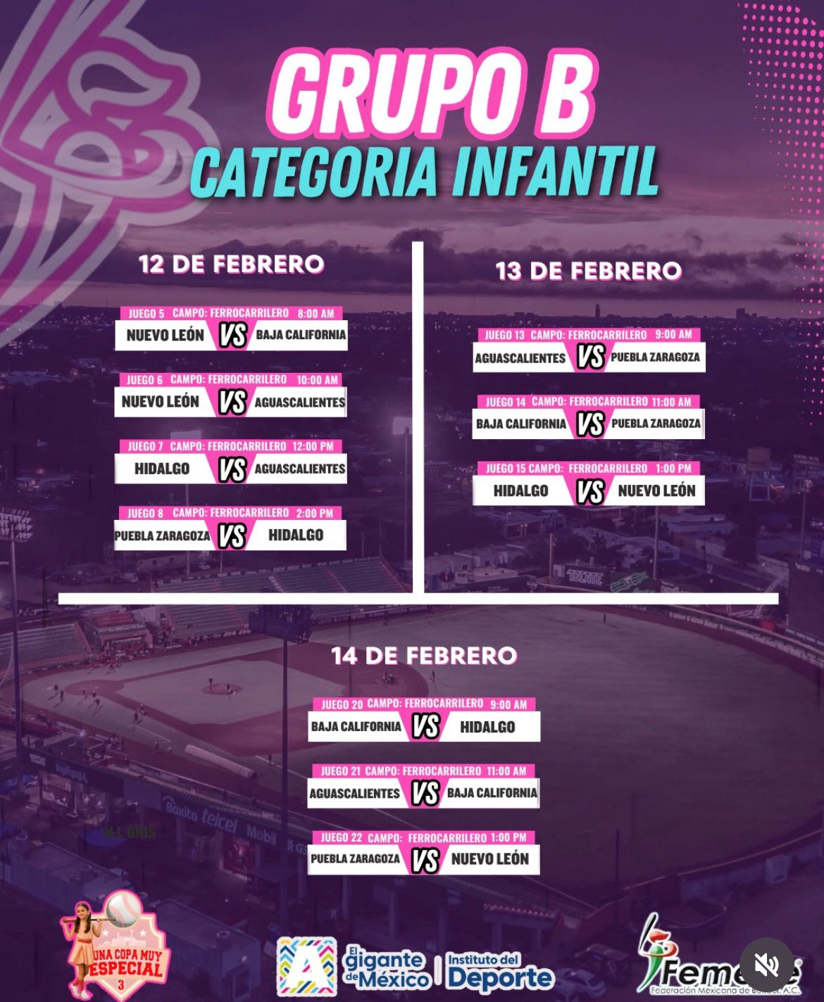 La actividad arrancará el 12 de febrero con encuentros programados desde las 8:00 y 9:00 de la mañana en los distintos campos sede. En la Categoría Infantil Grupo B, en el Campo Ferrocarrilero, se enfrentarán Nuevo León vs Baja California (8:00 am), Nuevo León vs Aguascalientes (10:00 am), Hidalgo vs Aguascalientes (12:00 pm) y Puebla Zaragoza vs Hidalgo (2:00 pm).