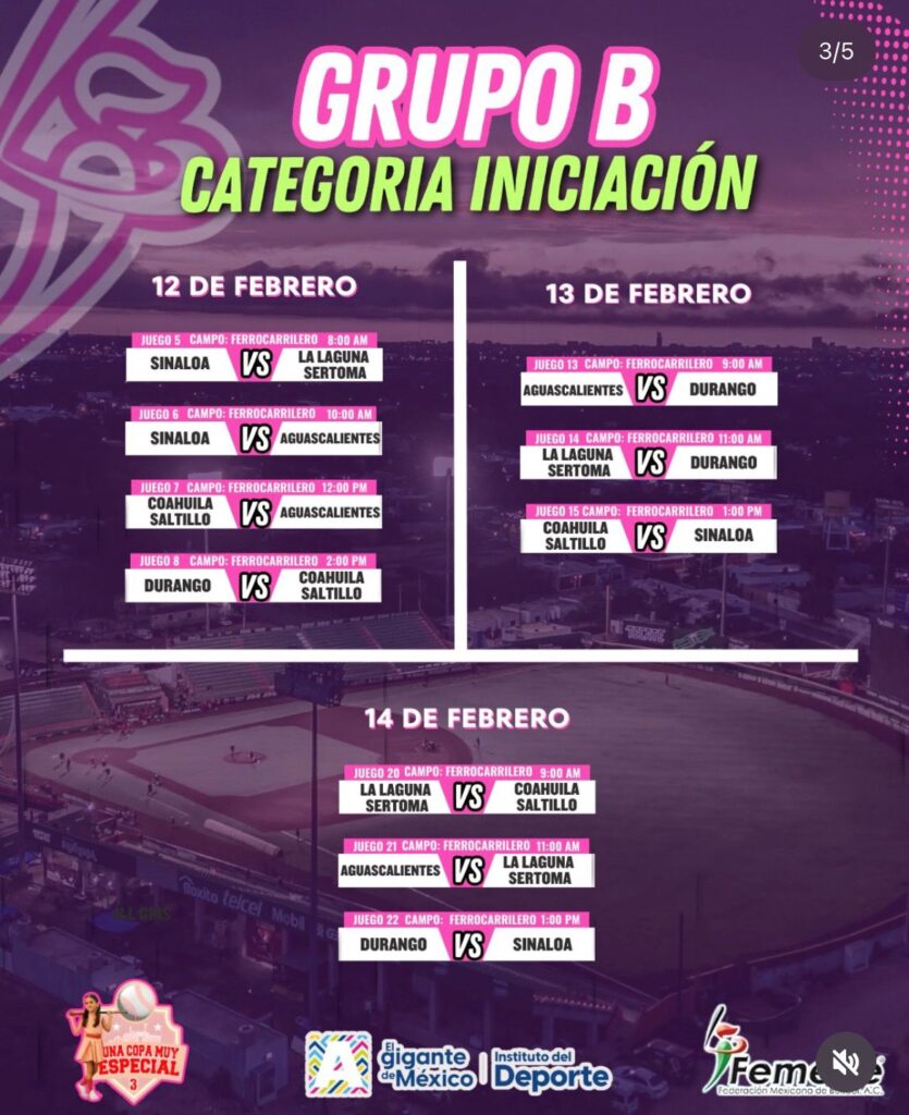 Ese mismo día, en la Categoría Iniciación Grupo B, también en el Campo Ferrocarrilero, jugarán Sinaloa vs La Laguna Sertoma (8:00 am), Sinaloa vs Aguascalientes (10:00 am), Coahuila Saltillo vs Aguascalientes (12:00 pm) y Durango vs Coahuila Saltillo (2:00 pm).