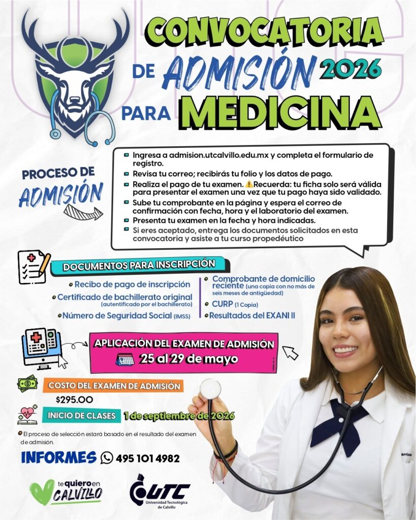 🩺📚 La oportunidad de estudiar Medicina en Aguascalientes se fortalece con la convocatoria 2026 de la Universidad Tecnológica de Calvillo, una opción educativa que acerca la formación profesional a las y los jóvenes del interior del estado, evitando traslados y permitiendo construir un proyecto de vida desde su propio entorno. 👇🏽👇🏽