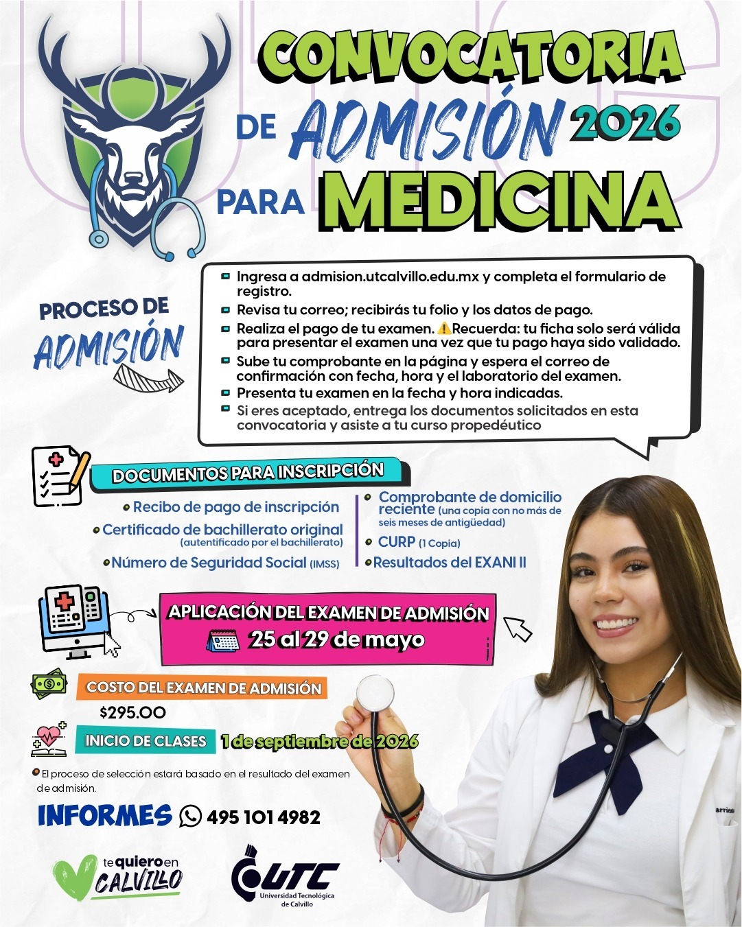 La convocatoria de admisión ya se encuentra disponible para quienes buscan ingresar a la carrera de Médico Cirujano y Partero. El registro se realiza en línea a través de la plataforma oficial admision.utcalvillo.edu.mx, donde las y los aspirantes deberán completar su formulario y seguir paso a paso el proceso establecido.