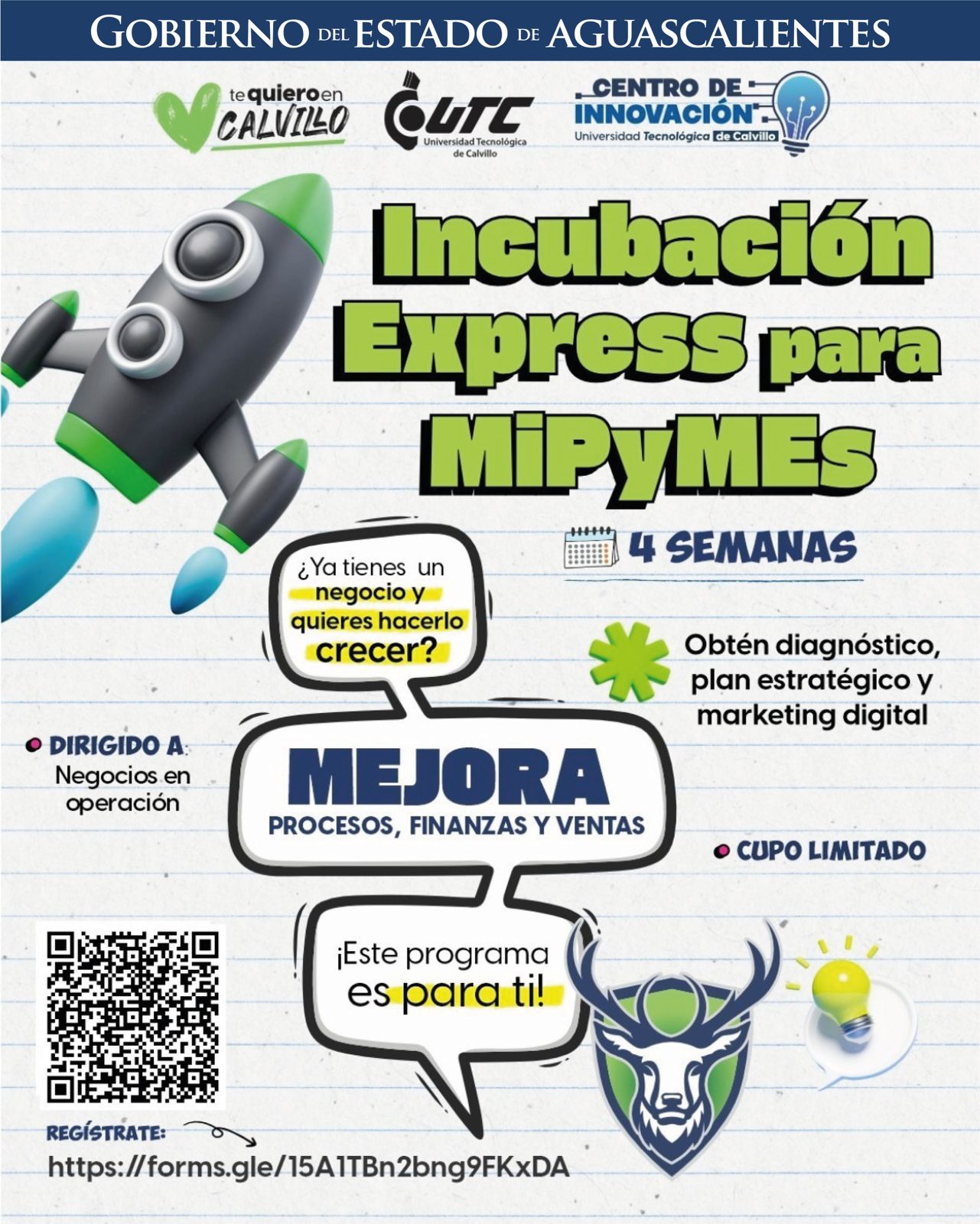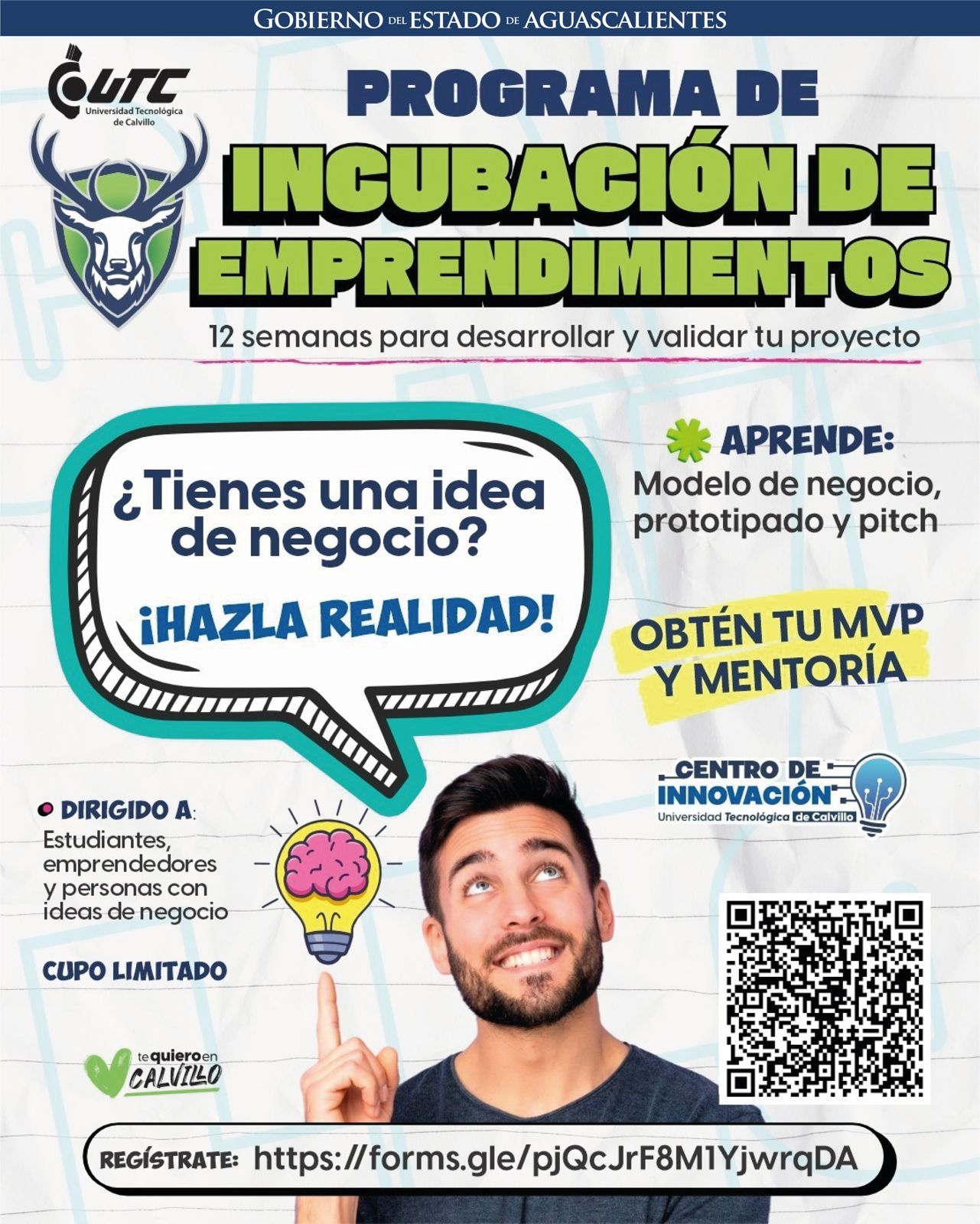 El cupo es limitado y los programas iniciarán en el mes de mayo. Para mayores informes, se encuentra disponible el correo centro.innovacion@utcalvillo.edu.mx , las redes sociales oficiales https://www.facebook.com/UTCalvillo , así como el teléfono 495 956 50 63, extensión 205.