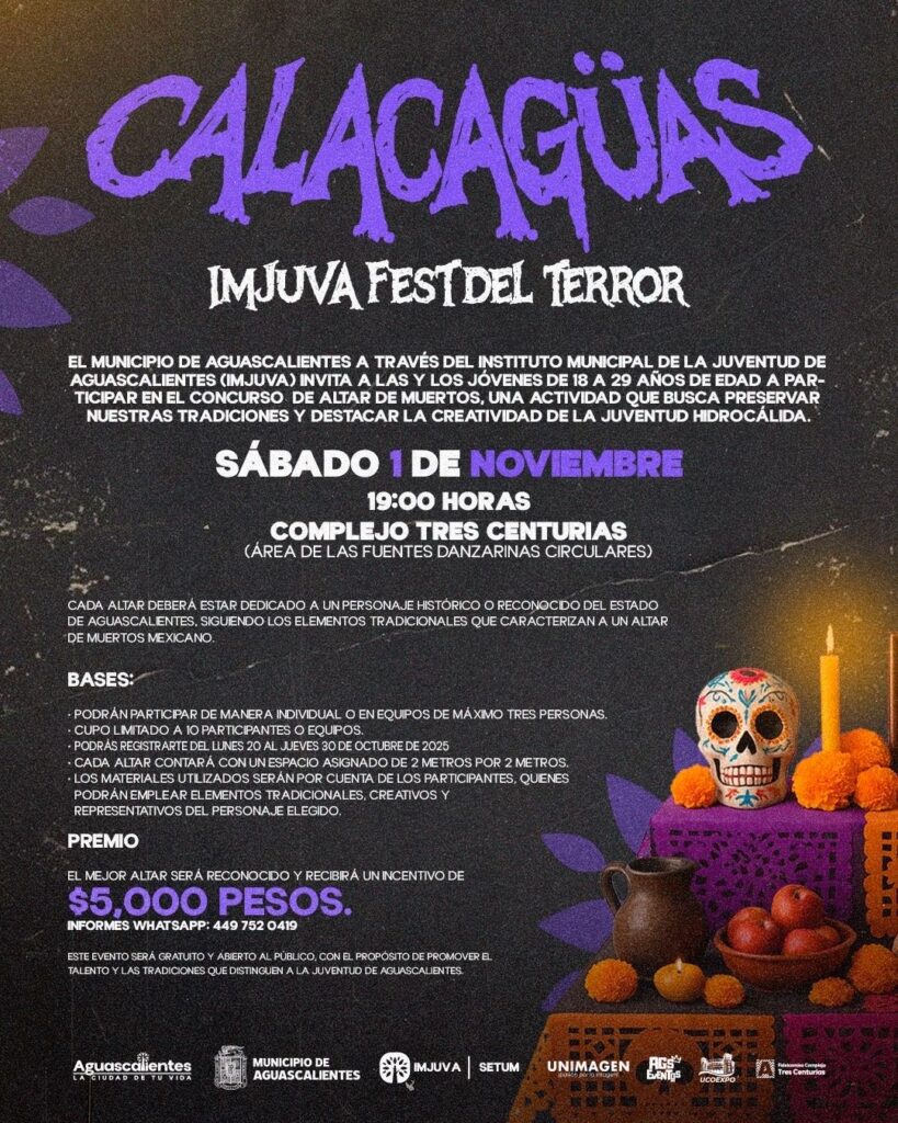 Este 1 de noviembre de 2025, la ciudad de Aguascalientes vivirá una de sus noches más esperadas: el “Calacagüas – IMJUVA Fest del Terror”, una celebración que mezcla el arte, la juventud y la tradición del Día de Muertos en un mismo escenario: el Complejo Ferrocarrilero Tres Centurias. A partir de las 17:00 horas, el recinto se transformará en un corredor de color, talento y emoción, con actividades gratuitas para toda la familia. ![]()