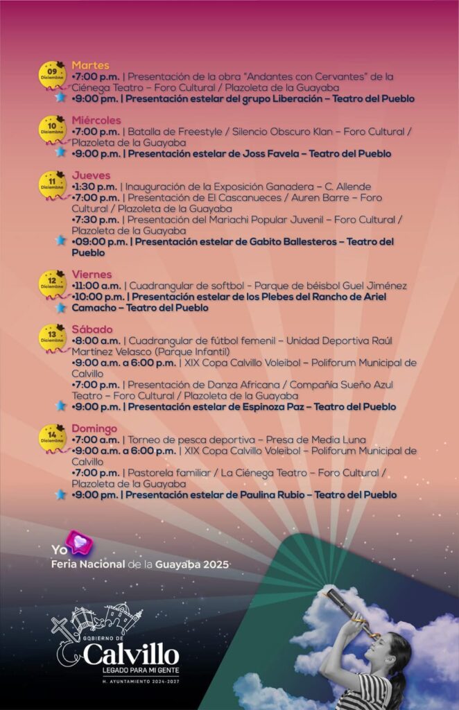 Cada día, desde el 5 hasta el 14 de diciembre, Calvillo abre sus brazos para recibir visitantes que buscan música, sabores, tradición, espectáculos y un ambiente lleno de identidad. La Feria Nacional de la Guayaba 2025 no es solo una agenda de eventos: es la demostración clara del Legado Para Mi Gente, un proyecto que pone a Calvillo en los ojos de todo México.